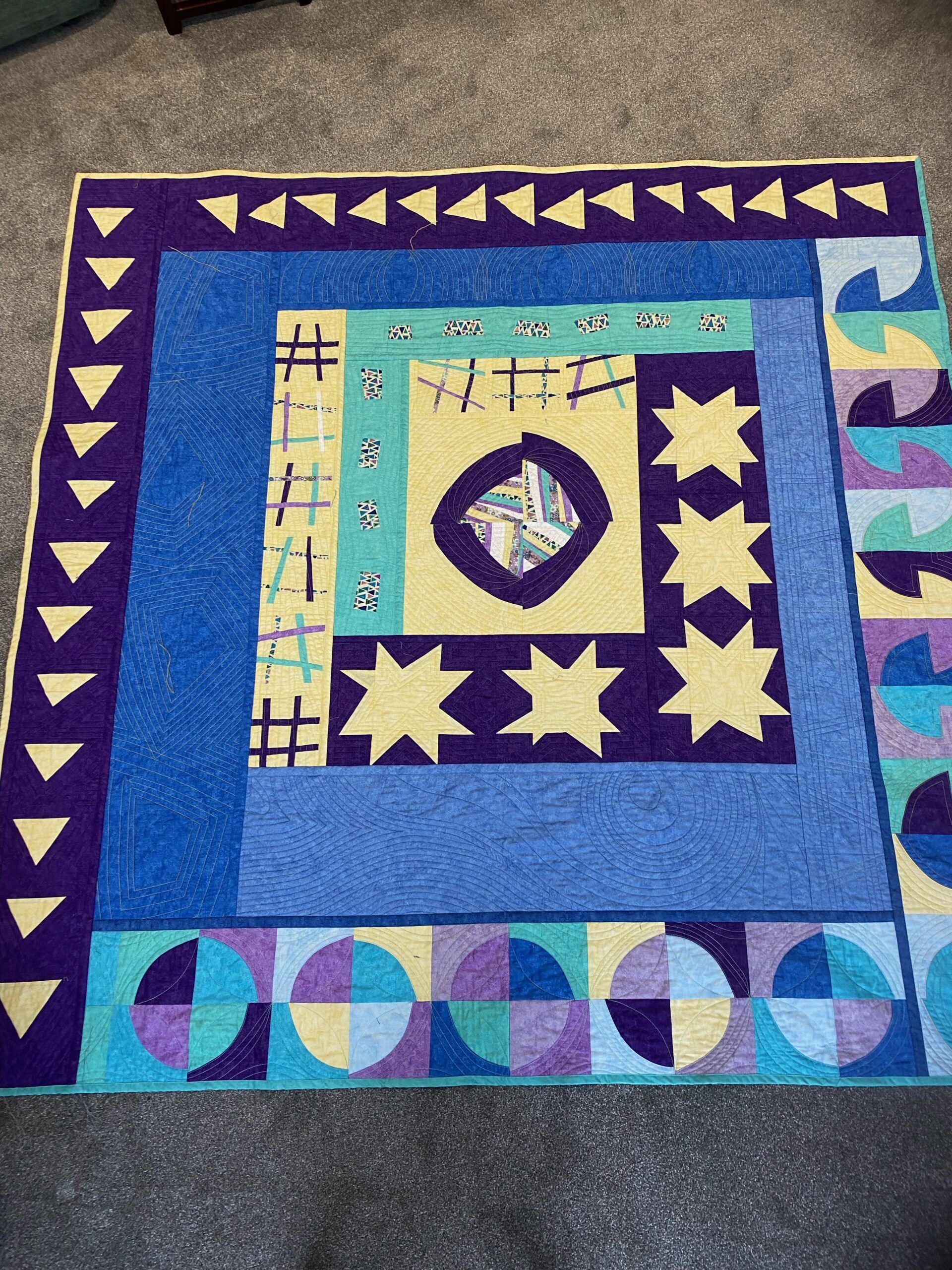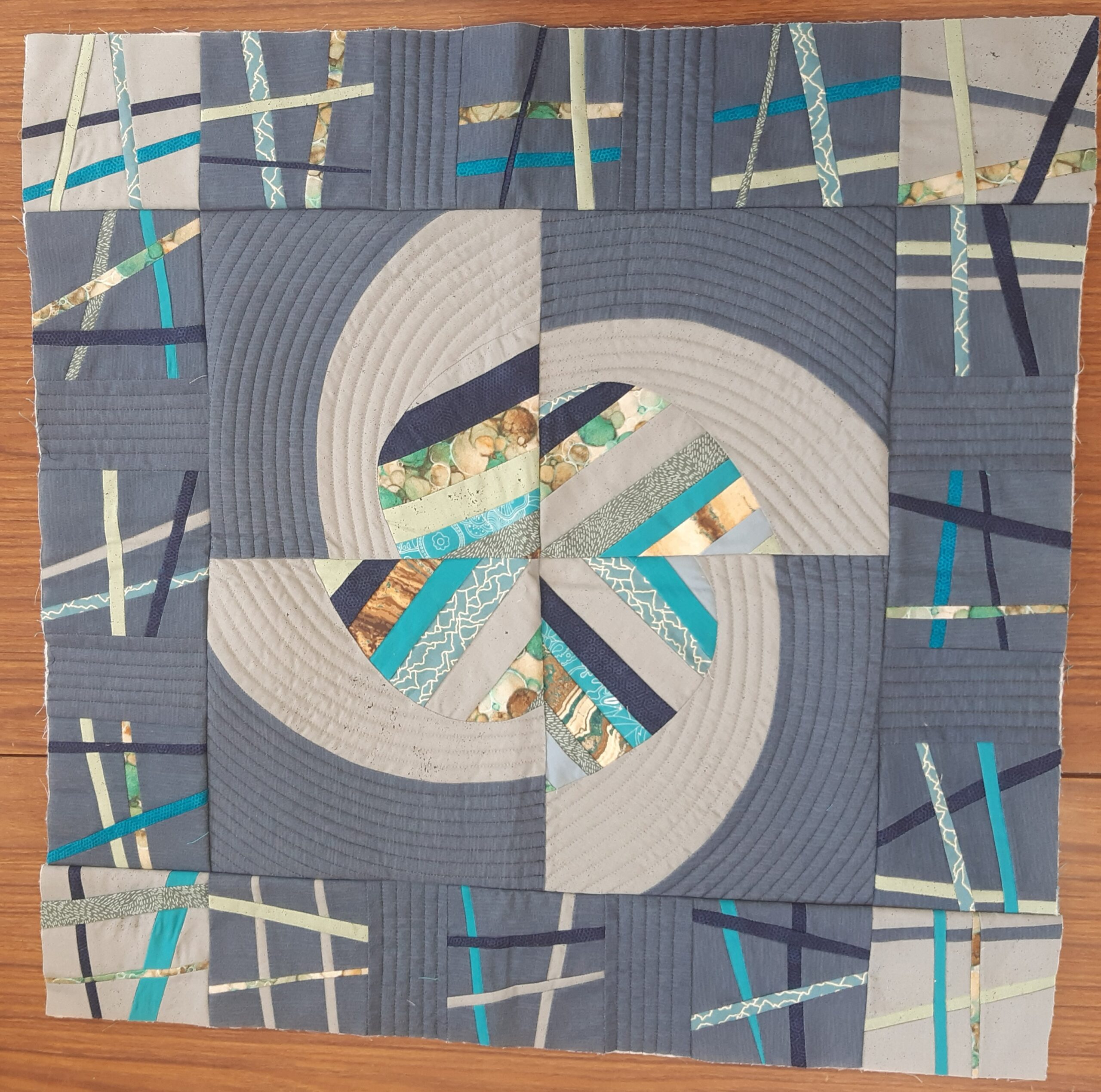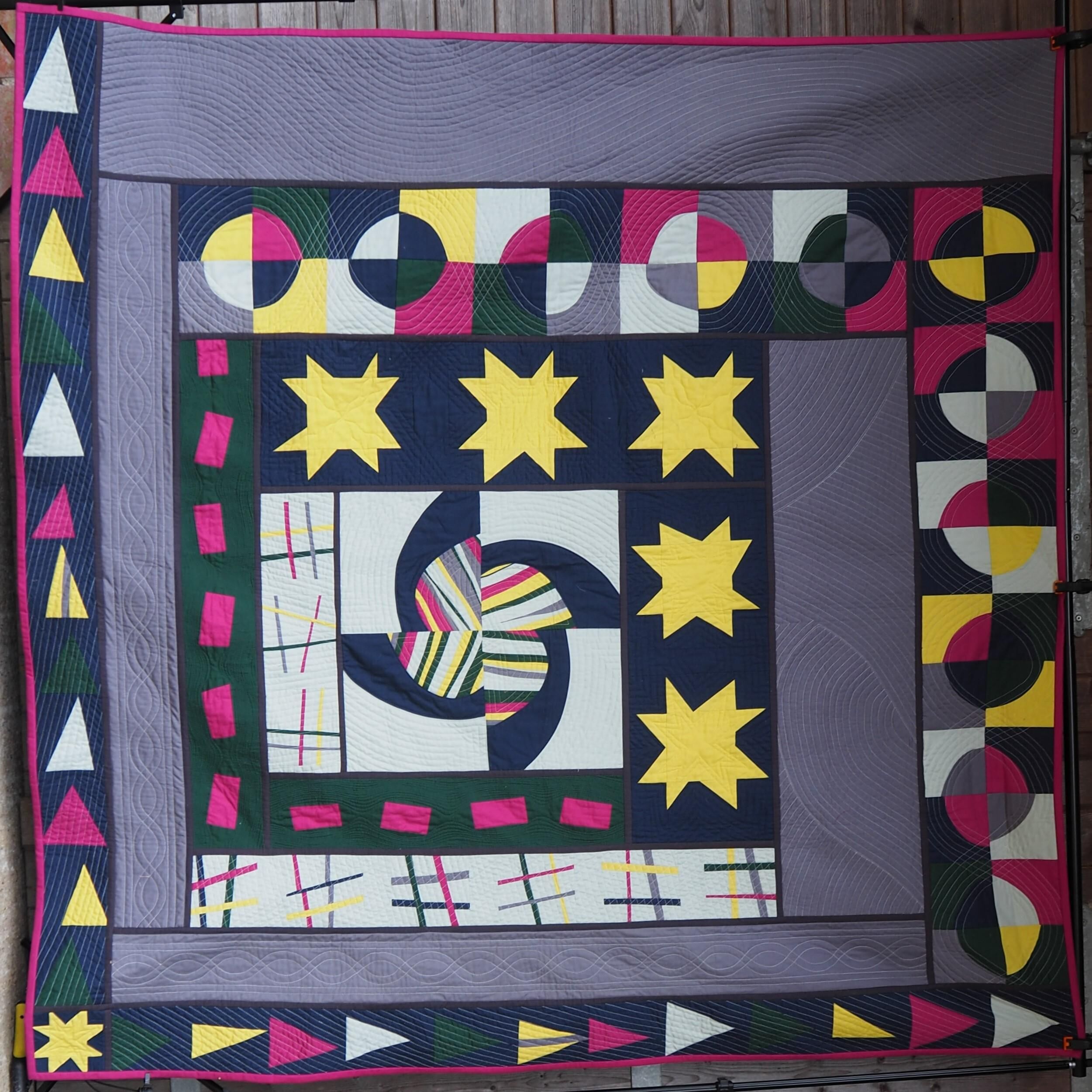 Techniques used include freehand cutting and piecing, curved cutting and piecing, walking foot (or free motion) quilting, improv versions of Flying Geese and Drunkards Path blocks, Floating Square and Hashtag blocks.